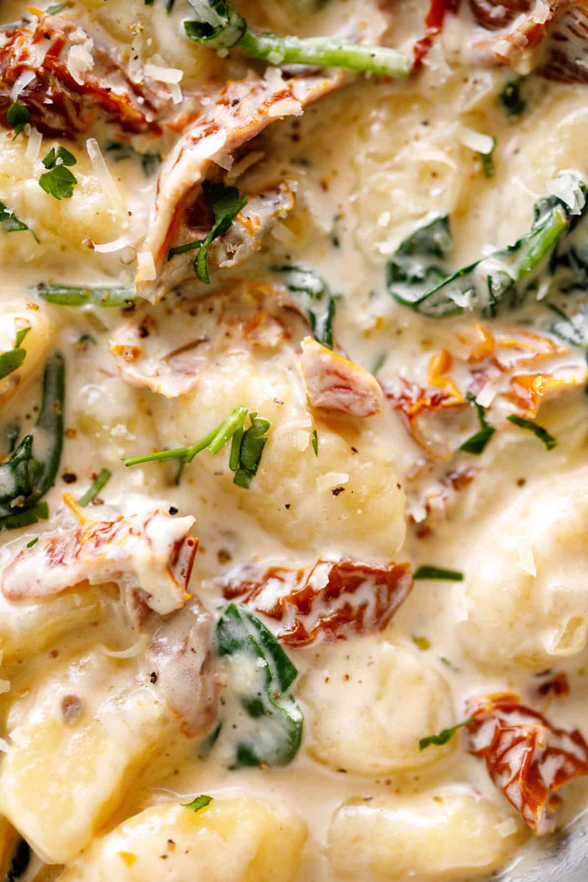 Soft, tender pillows of gnocchi enveloped in a full-flavoured cream sauce with sun-dried tomatoes, spinach, garlic and fresh basil. Creamy Tuscan Gnocchi is the